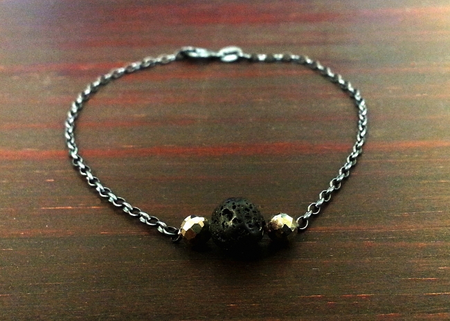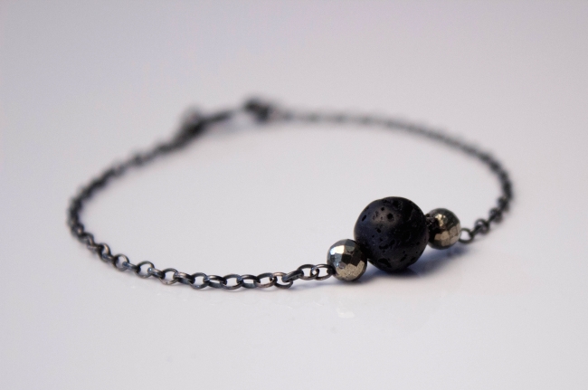 A little touch of Mother Nature's sparkly bits are the hero of this silver or oxidised (blackened) silver bracelets. The sparkly bits are real gemstones in the form of black lava and pyrite beads, which are hand strung onto silver chain to form something pretty and precious for any occassion.