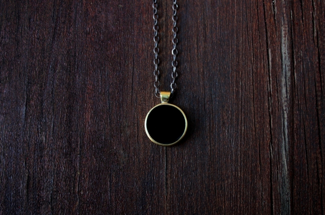 « Back to Necklaces Brass pendant with black cold enamel insert on oxidised [blackened] silver chain Also available o silver chain in 45cm or 50cm on request. Buy